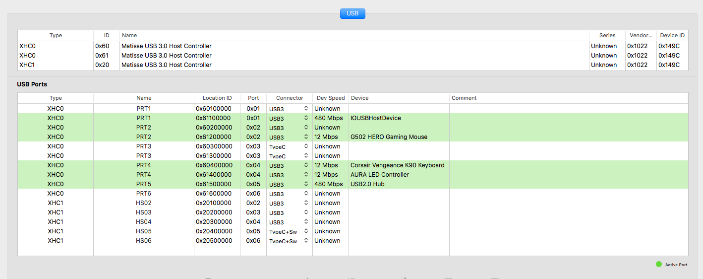 Having two controllers named the same is probably causing some issues when you configure your USB setup. If there were some way to differentiate the two XHC0 controllers and use an ACPI rename patch to change one of the two controllers, that might make it simpler.